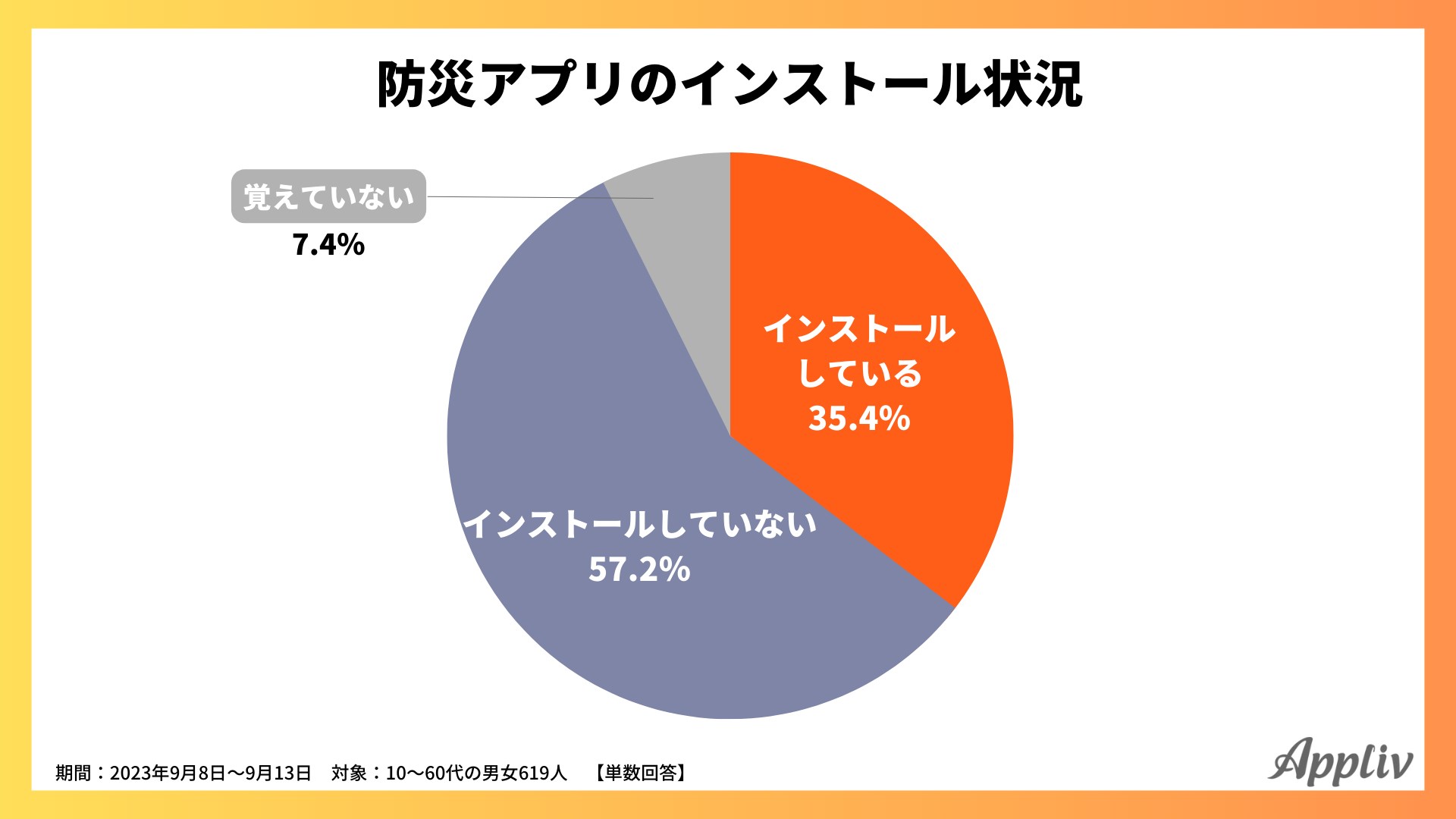 スマートフォンに防災アプリをインストールしているかどうかについては、「インストールしている(35.4%)」、「インストールしていない(57.2%)」という結果になりました。約3人に1人が防災アプリをインストールしているようです。