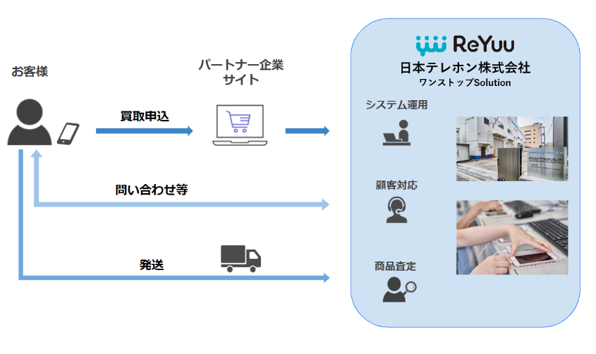 「スマートトレードイン」を利用することで、パートナー企業はシステム運用・顧客対応・商品査定を日本テレホンにワンストップで委託することが可能になります。