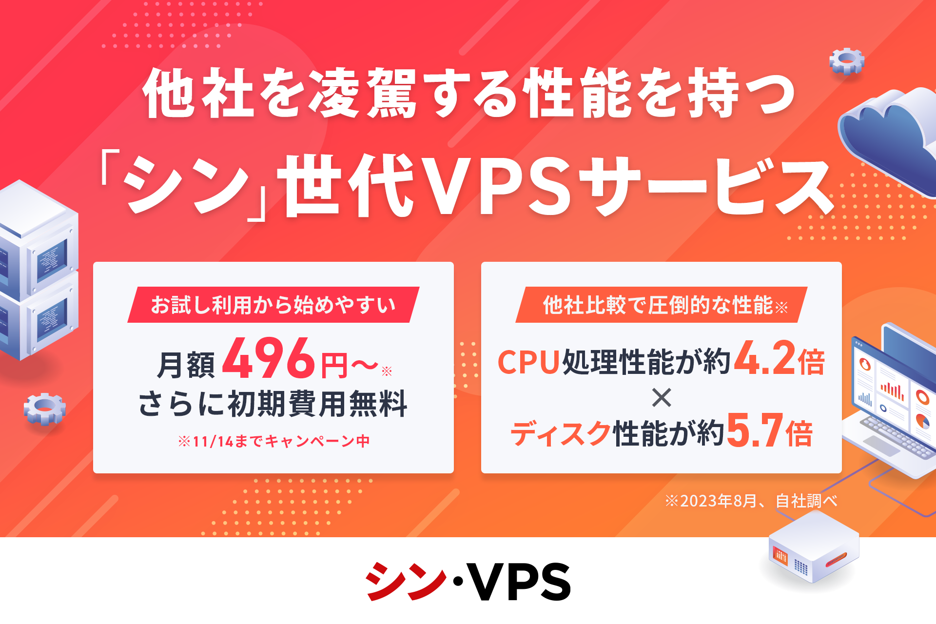『シン・VPS』のリリースを記念して、本日から11月14日(火)12:00まで、利用料金が最大20%オフになる「リリース記念キャンペーン」を実施します。期間中は、月額496円から『シン・VPS』を利用できます。