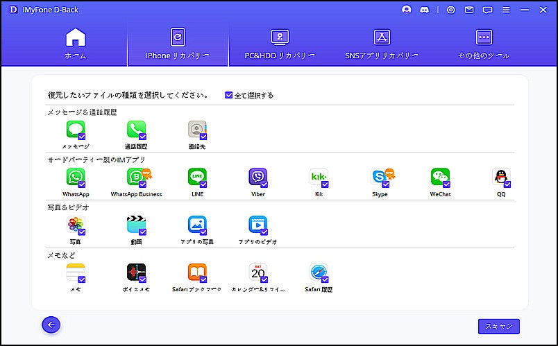 ステップ 2:バックアップしたいデータ種類にチェックを入れて、「スキャン」をクリックします。