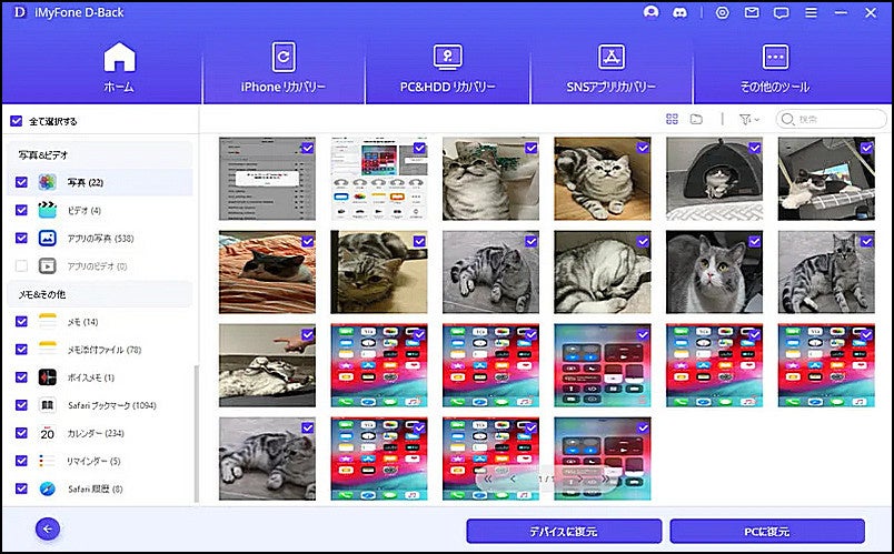 ステップ 3:バックアップしたいデータを選択して、「PCに復元」をクリックするとお使いのパソコンにバックアップします。