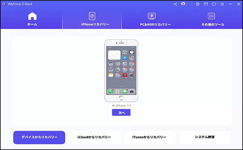ステップ 1:まず、D-Backを起動してから、「デバイスからリカバリー」を選びます。その後、iPhoneをパソコンに接続して、「次へ」をクリックします。