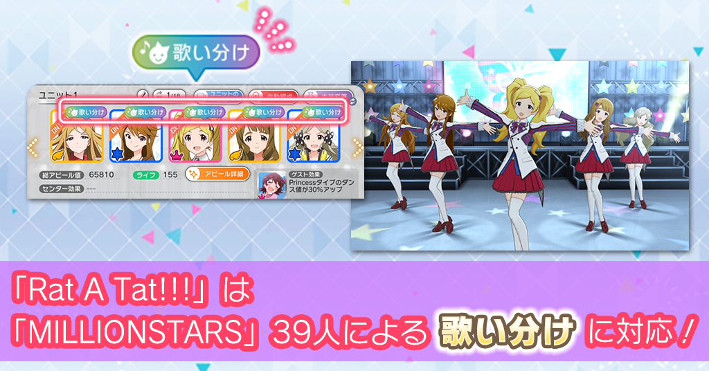 イベント楽曲「Rat A Tat!!!」は『MILLIONSTARS』39人による歌い分けが楽しめます。