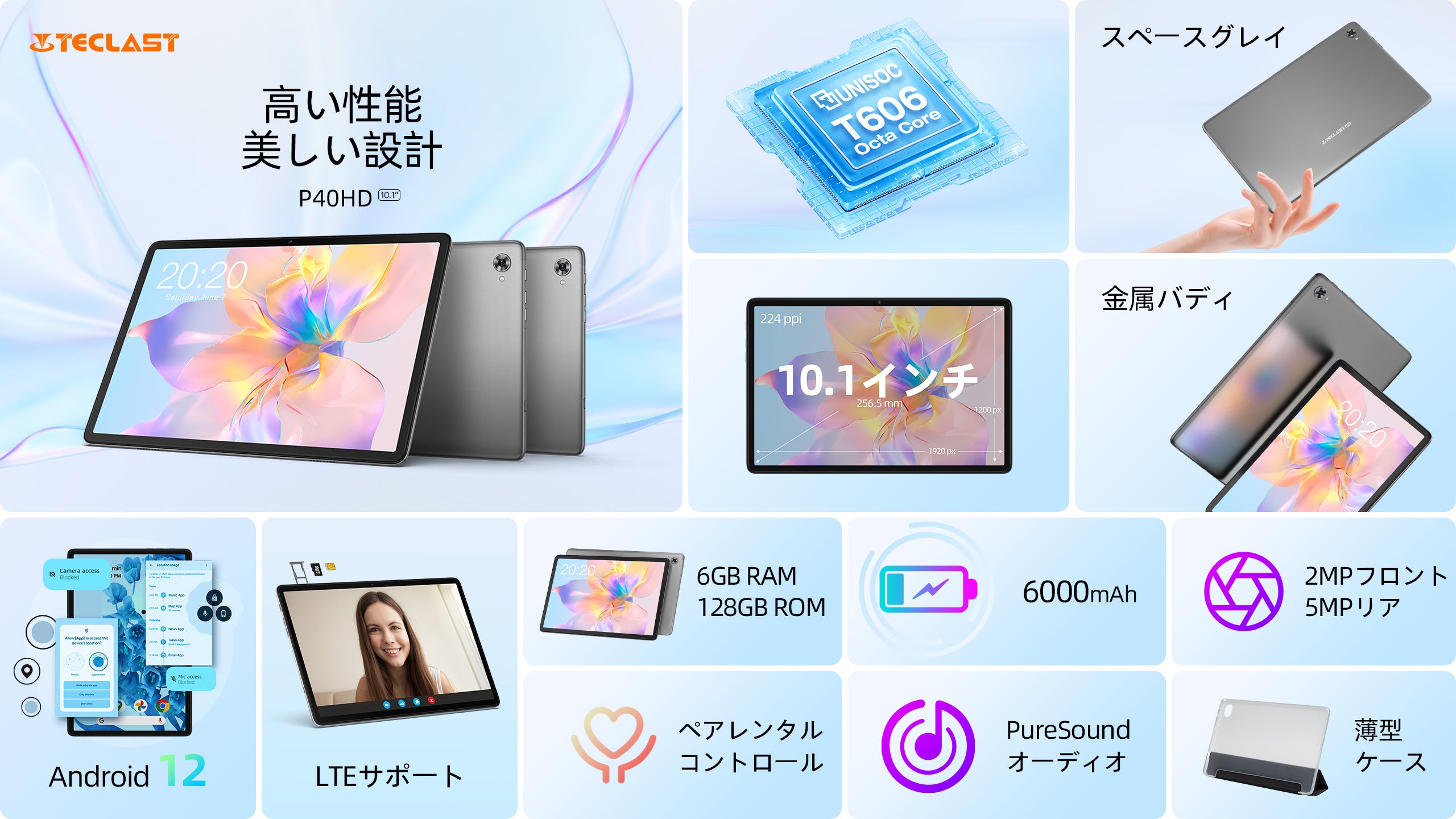 TECLAST P40HD Android 12 タブレット 10インチ 6GB+128GB+1TB TF拡張 UNISOC 8コアCPU 10″ FHD IPS 1920*1200解像度タブレット4G LTEモデル+ Wi-Fiモデル WiFi 2.4G/5G+BT 5.0+6000mAh 日本語取扱説明書付き