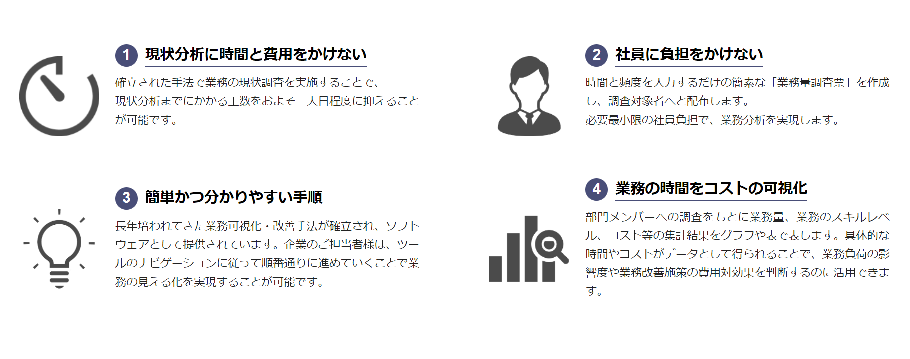 これまでの多くの時間や費用をかけて取り組んだり、外部に依頼してきた現状調査を社内で手軽に実施することができる業務可視化・業務改善支援ツールです。