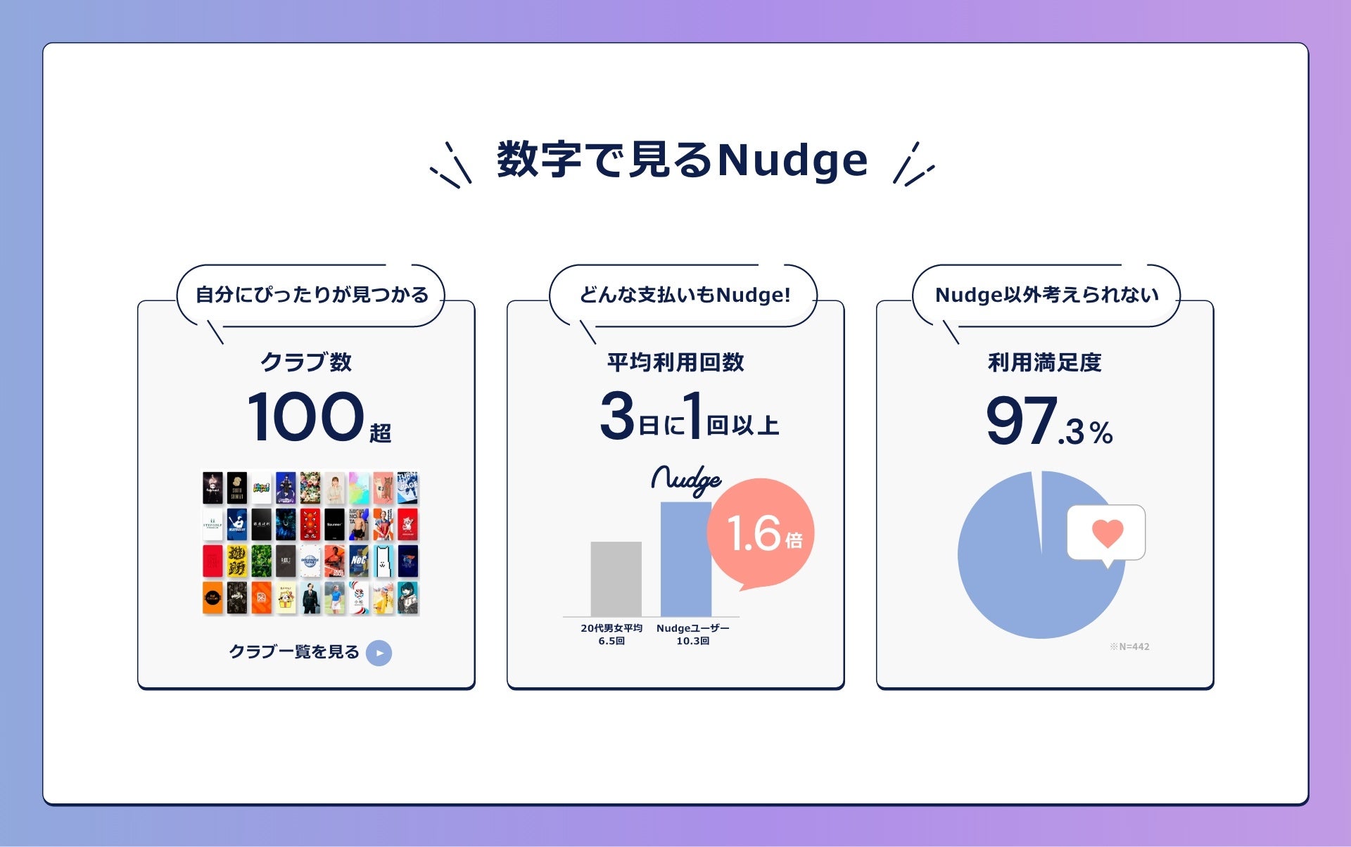 公式クラブ数や平均利用回数、利用満足度からNudgeをご紹介します。 |