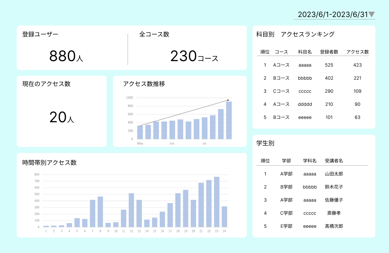 「Moodle(ムードル)」をしっかり活用できているか、一目で分かりやすく利用状況を把握することが可能となり、学習管理がしやすくなります。たとえば、アクセス数推移が下降傾向にあるとわかれば、受講者へのアナウンスや課題を作るなど、一早く対策することができます。