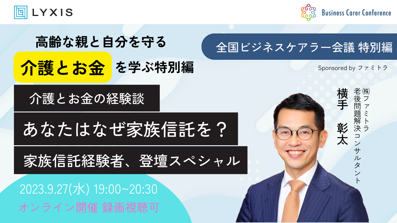 今回、成年後見の専門家である株式会社ファミトラの横手彰太氏と、実際に家族信託の組成を経験した方をお招きして、なぜ「家族信託」を選択したのか、認知症による親の資産凍結から財産を守るための対策について、解説をいただきます。