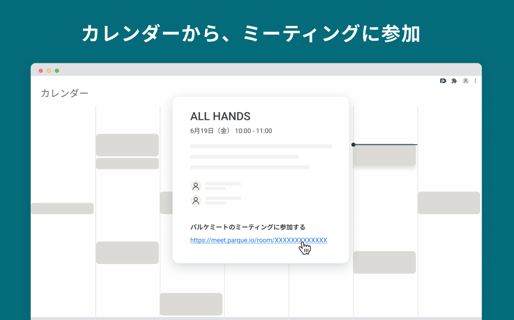 「パルケミート for Google Chrome」より無料でインストールでき、お持ちのパルケアカウントでログインするだけで連携されます。これにより、パルケミートにアクセスせずにGoogleカレンダー上で「ミーティングの開催と招待」をスムーズにおこなうことができます。