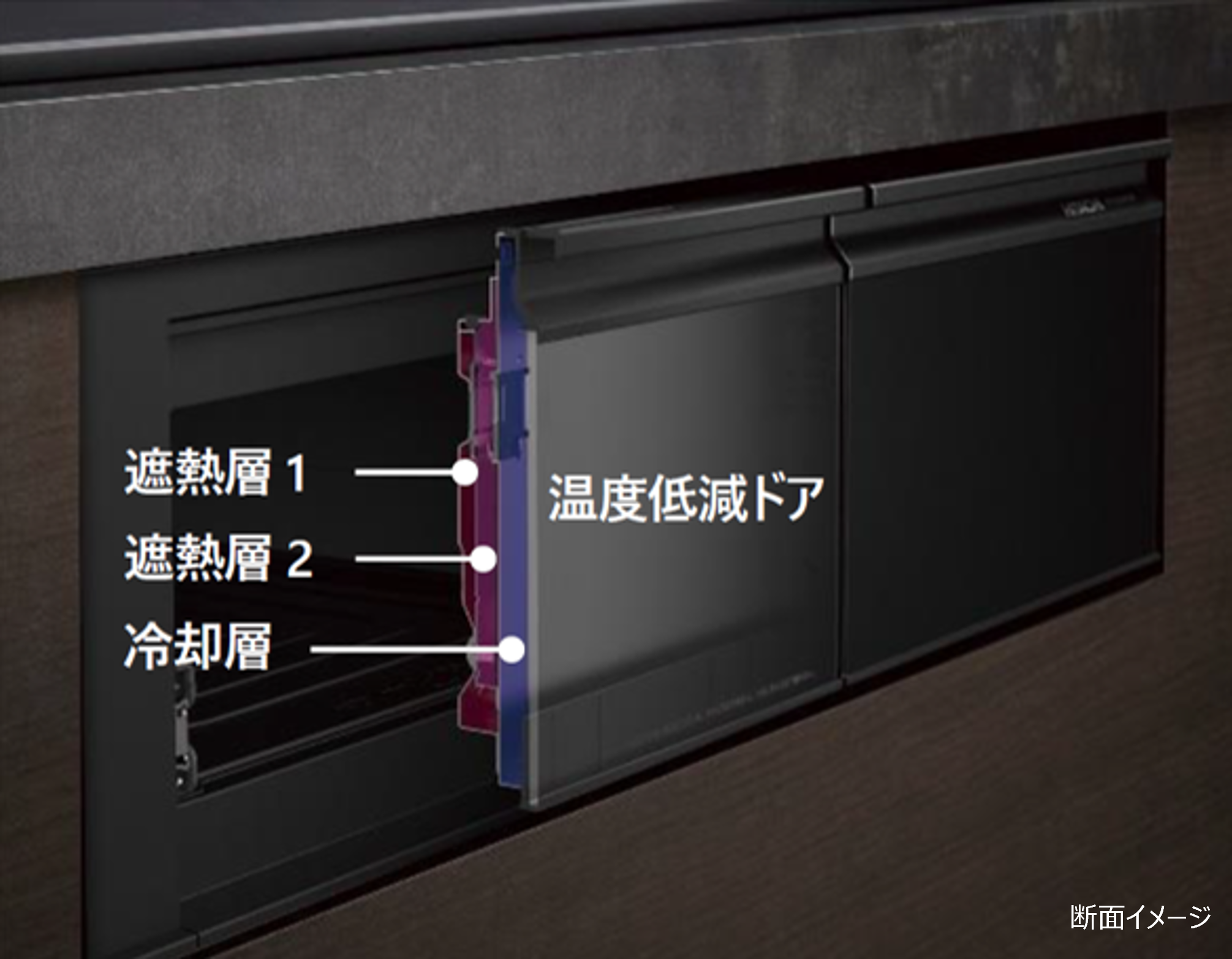 日立IHクッキングヒーターでは、日立独自の放熱技術により、グリル調理時のドア外側の温度上昇を抑える「温度低減ドア」を2019年度製品Mシリーズから採用しています。グリルドアに遮熱層と冷却層を設け、遮熱層でグリル庫内の熱を遮断しながら、冷却層に空気の流れをつくり、自然対流で暖められた空気を排出(放熱)することで、表面の温度上昇を抑制します。この取り組みが評価され、第13回キッズデザイン賞「子どもたちの安全・安心に貢献するデザイン部門」を受賞しました。さらに、2022年度発売のNシリーズより、ドア表面温度の更なる低減をめざし、遮熱層を2層に増やし、冷却層と合わせた3層構造を採用したことにより、第17回キッズデザイン賞「子どもたちの安全・安心に貢献するデザイン部門」を受賞するとともに、「BEYOND COVID-19特別賞」を受賞しました。