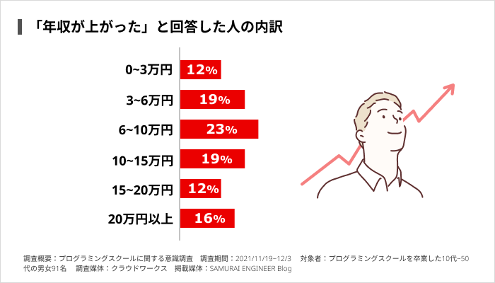 前の質問で、プログラミングスクール卒業後に年収が「上がった」と回答した人に「年収の増加額」を聞いたところ、「6〜10万」と回答した人が最多で23%、次いで「3〜6万円・10〜15万円」と回答した人が2番目に多い19%、「20万円以上」と回答した人が16%という結果となりました。