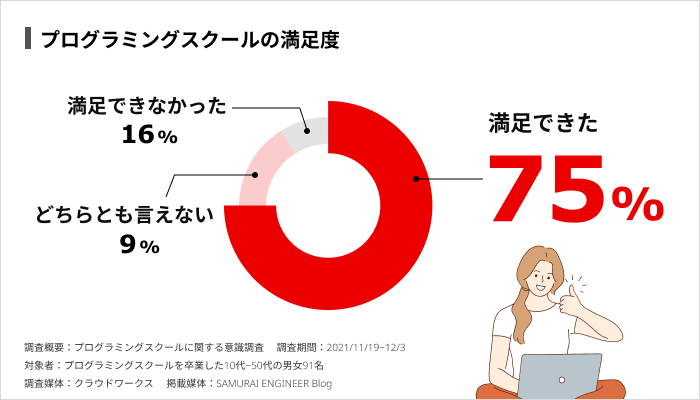 最後に、「プログラミングスクール受講における満足度」を聞いたところ、75%の人が「満足できた」と回答し、9%の人が「どちらとも言えない」、16%の人が「満足できなかった」と回答しました。