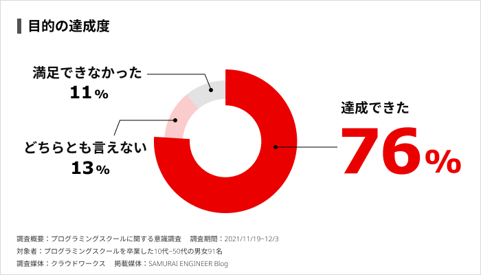 「プログラミングスクール受講における目的の達成度」を聞いたところ、全体の76%の人が「達成できた」と回答しました。一方、「どちらとも言えない」と回答した人が13%、「満足できなかった」と回答した人が11%でした。