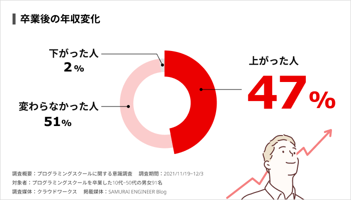 [1]プログラミングスクール卒業後に「年収が上がった」と回答した人は47%