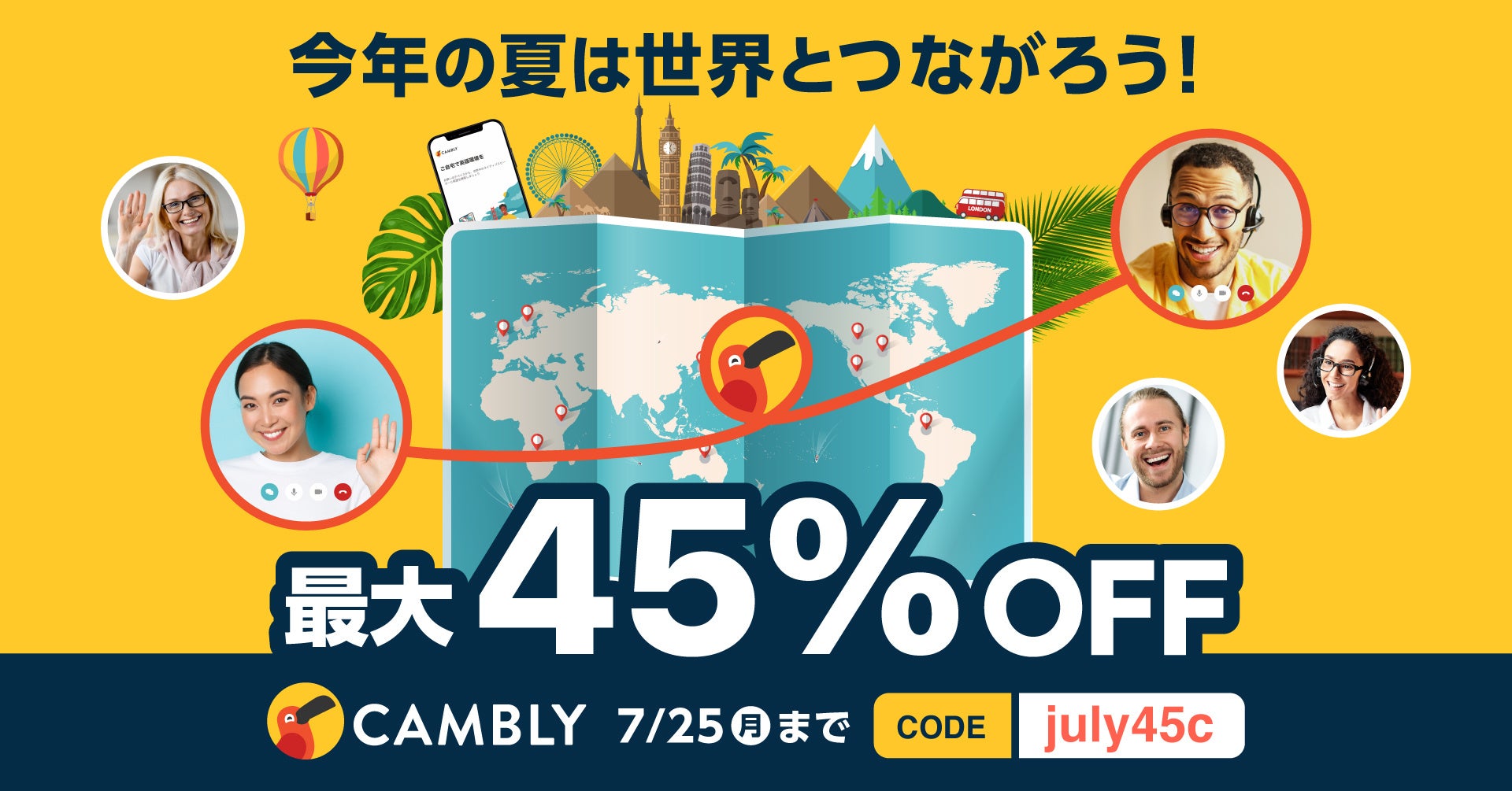 そんなCamblyのオンライン英会話レッスンが、7月21日(木)から7月25日(月)までの5日間で、最大45%OFFと大変お得にご利用いただけます。この機会にぜひCamblyをお試しください!