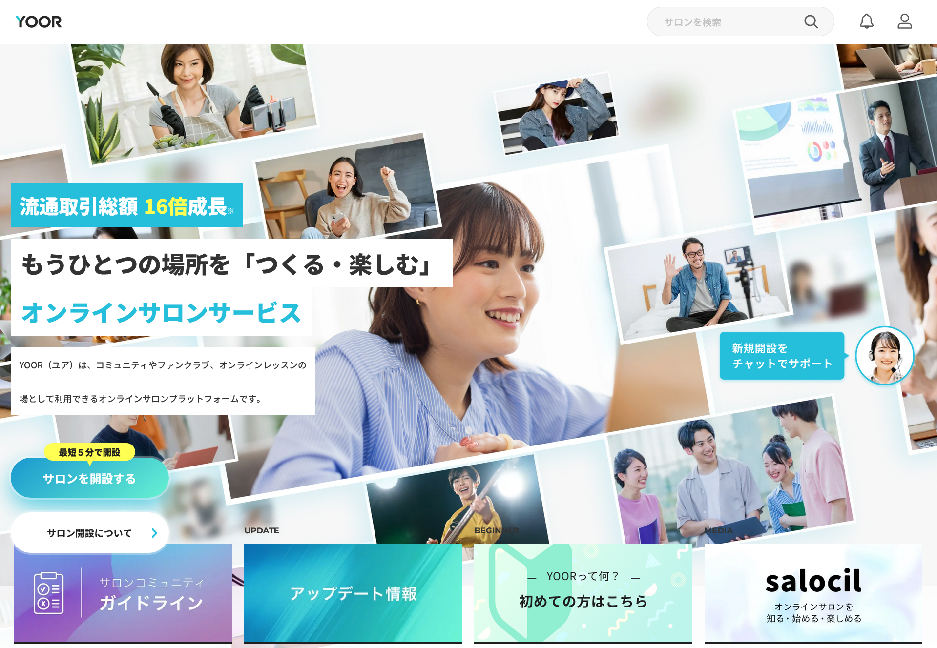 YOORは、誰でも自由にオンラインサロンを開設できるサービスです。趣味のコミュニティやファンクラブ、オンラインレッスンの場として様々なオーナーがサロンを主宰しています。サロンのメンバーは、価値観が同じ仲間と交流を深める、新しい知識を学ぶなど、新しい体験が可能です。
