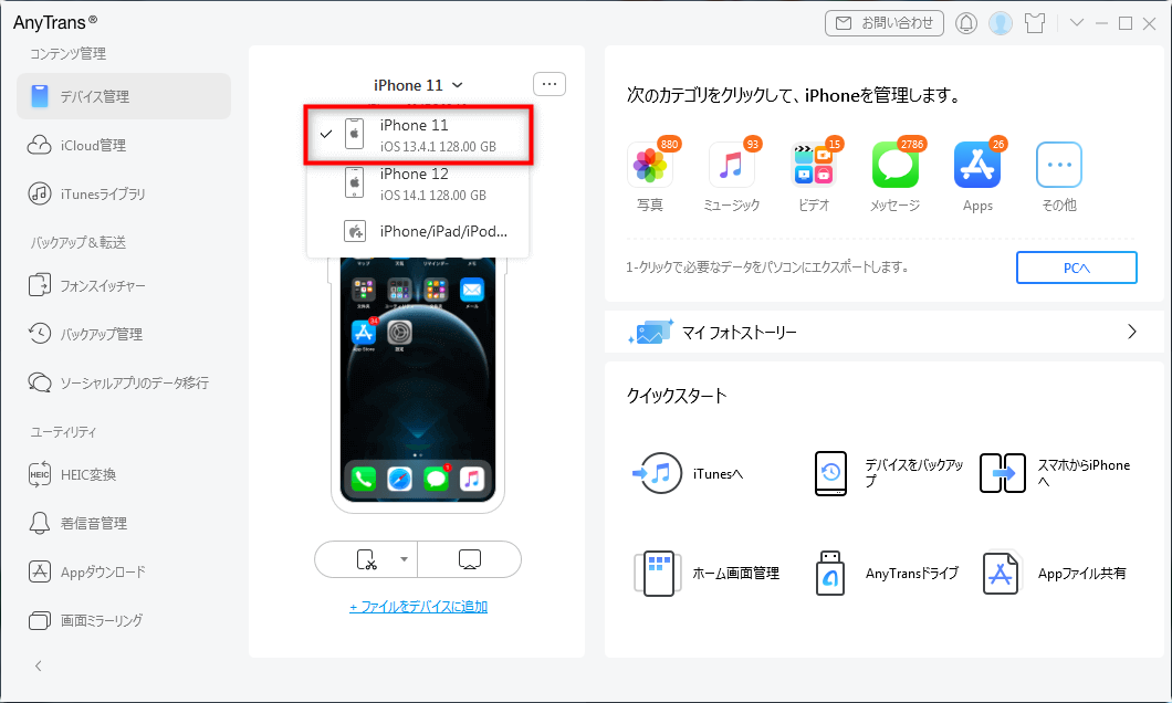 AnyTransはiPhoneデータ管理の専用ソフトです。写真や動画、ファイル、アプリ、およびLINEのトーク履歴などの27種類のiOSデータを管理でき、気軽に移行することができます。iPhoneだけでなく、AnyTransはiOS 5及び以上を搭載したiPhone、iPad、iPod touchの全機種を適応しています。