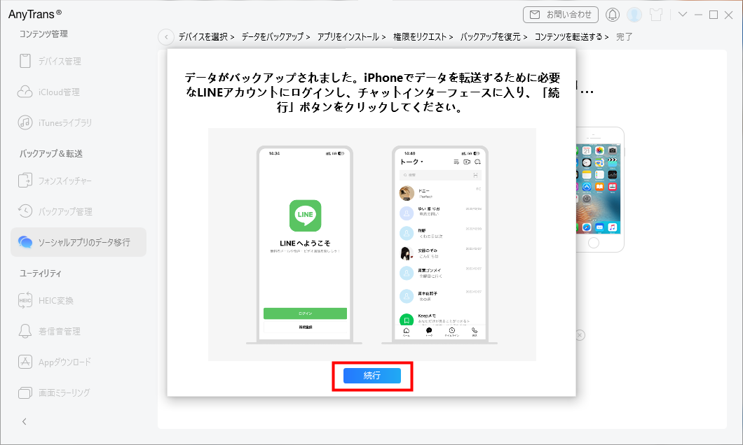 Step5.バックアップしてから、「続行」ボタンをクリックします。そしてiPhoneのパスワードを入力します。