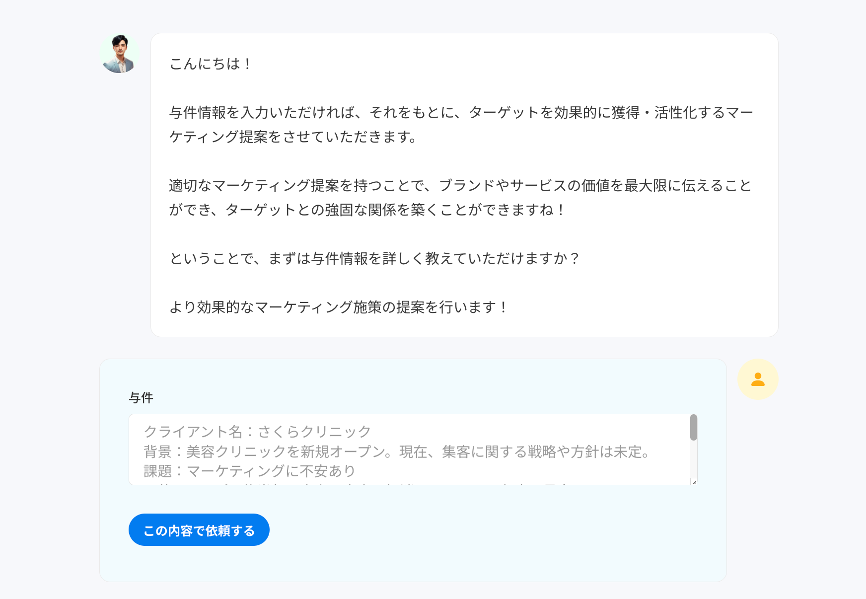 与件情報を入力すると、製品・サービスの市場戦略や差別化のポイントを明確に伝える戦略的マーケティング提案を作成してくれるツールです。製品・サービスの市場浸透率を高め、消費者のロイヤルティや関心をより引きつけるために働くマーケティング組織に対して寄与します。