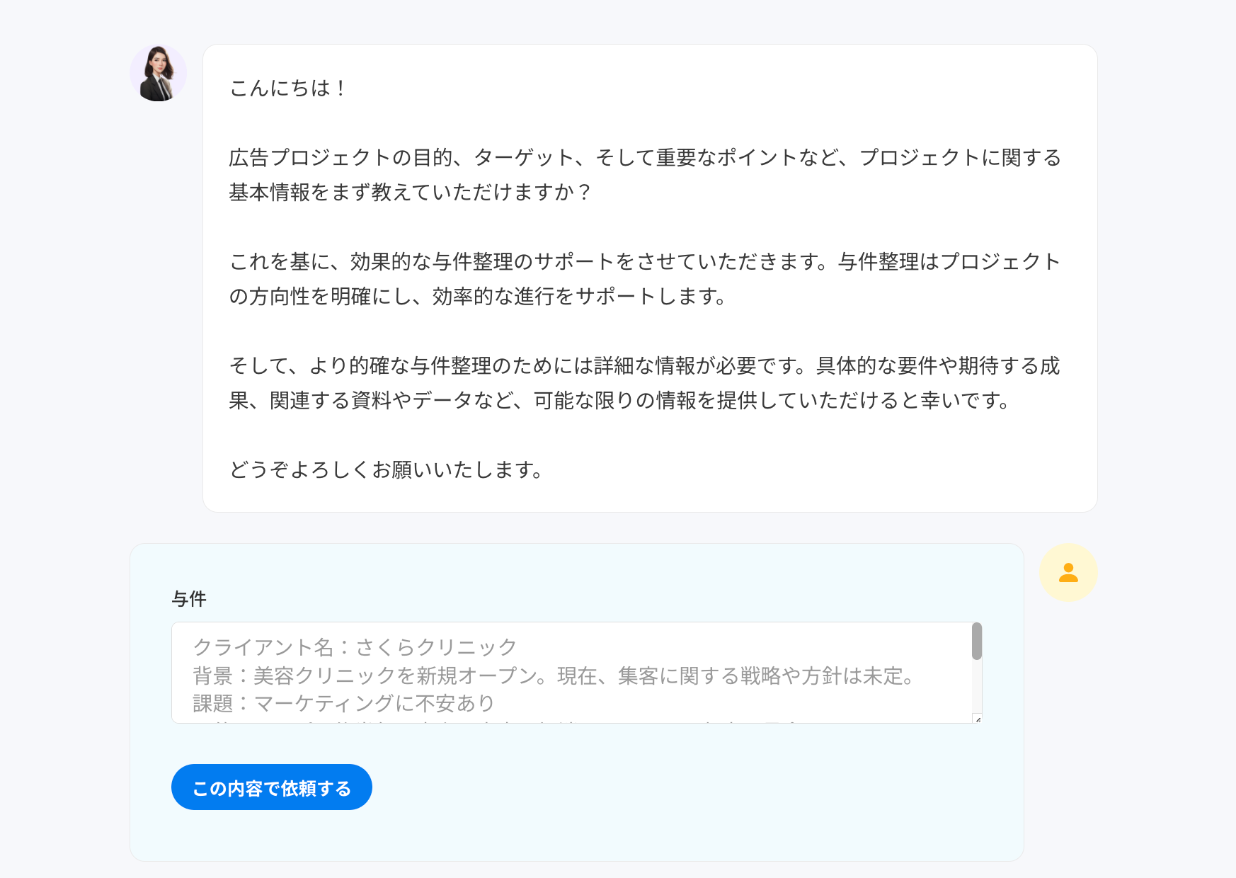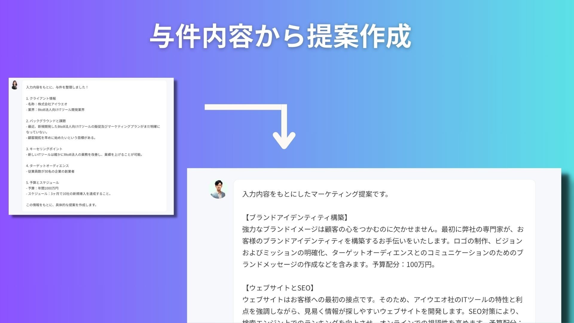 会議の議事録やメモを入力すると、プロジェクトやタスクの要点、必要性を与件整理してくれるツールです。チームや関係者に対してプロジェクトの方向性や目的を即座に伝え、ミスの低減、組織全体の生産性向上に寄与します。