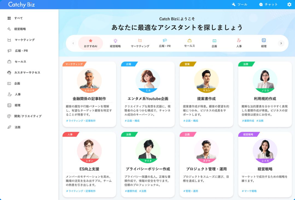 β版公開以降に開発し、正式公開を行った「Catchy Biz」内のAIツールは、これらの業務の一部を自動化します。