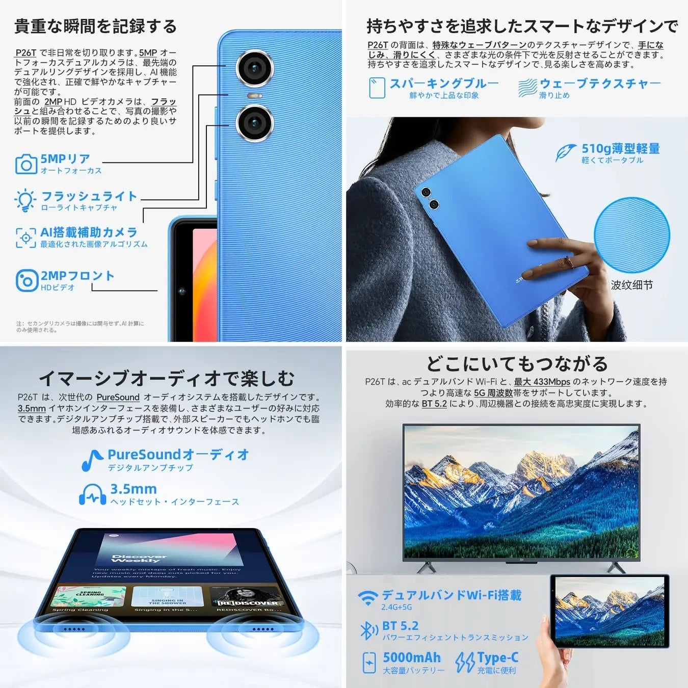 4GB+4GBの仮想メモリを追加され、合計8GBのメモリでマルチタスクやアプリの切り替えをスムーズに行うことができます。アップグレードされた「P26T」は、128GBの高速内部ストレージと拡張可能なTFカードのサポートの柔軟性を組み合わせた、十分なストレージ容量をお楽しみください。acデュアルバンドWi-Fiと、最大433Mbpsのネットワーク速度を持つより高速な5G周波数帯をサポートしています。効率的なBT 5.0により、周辺機器との接続を高忠実度に実現します。