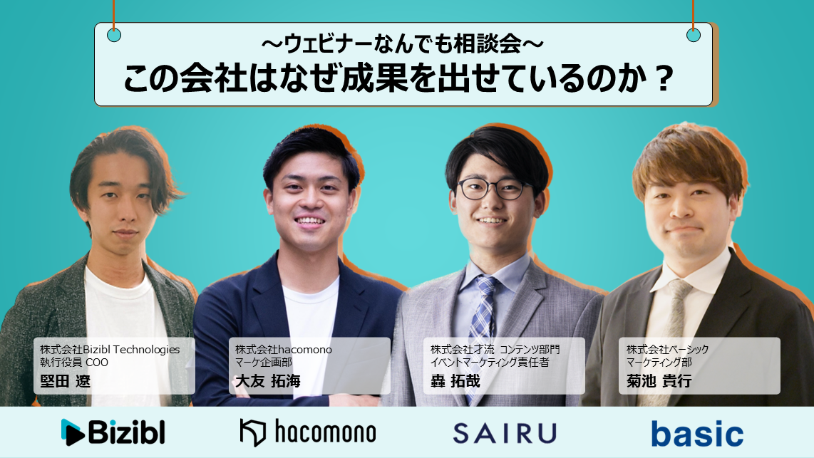 ~ウェビナーなんでも相談会~この会社はなぜ成果を出せているのか?|株式会社Bizibl Technologies 【ご好評につき再放送決定!】ウェビナーの成果が出ない...けど、社内に相談する相手もいない...こんな状態のウェビナーご担当者の方、多いのではないでしょうか?ウェビナー担当者は孤独です。社内で担当者が複数いることは稀で、施策の相談をする機会もありません。そこで今回は、ウェビナーなんでも相談会と題しまして実際に自社でウェ... |