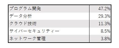 IT技術関連者の多くがプログラム開発とデータ分析の分野でIT人材不足を最も深刻に感じています。これらの分野における高度なスキルと専門知識が要求されるため、組織はこれらの領域でのリクルーティングとスキル開発に注力する必要があります。また、クラウド技術やサイバーセキュリティ分野も成長しており、これらの分野への投資も考慮すべきです。
