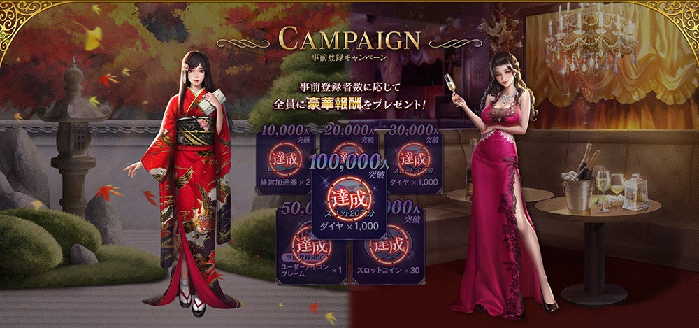 皆さまのおかげで事前登録者数が10万人を突破いたしましたので、ユーザー全員に「ダイヤ2,000個」「高級募集10枚」「スロットコイン30枚」「経営加速券2枚」「事前登録限定ユーザーアイコンフレーム」をゲーム開始時にプレゼントいたします!