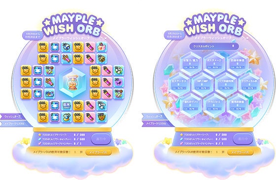 メイプラーアイランドを象徴する「メイプラーウィッシュオーブ」。3つのミッションのうちいずれかに参加すると「願いチャージ」が可能になります。「願いチャージ」を行うと、アイテムと「クリスタルポイント」が獲得できます。クリスタルポイントを消費して、バフやステータス増加といったメイプラークリスタルのスキル効果を強化することが可能です。