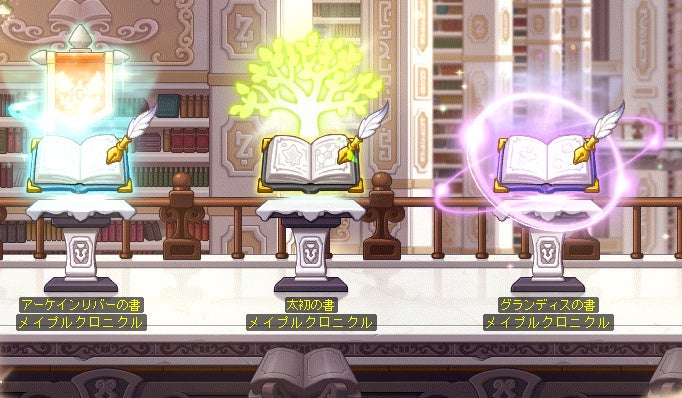 メイプルワールドの歴史や、これまでの冒険を振り返ることができる、次元の図書館の「メイプルクロニクル」に、職業ごとのストーリーを回想できる「太初の書」を追加いたしました。