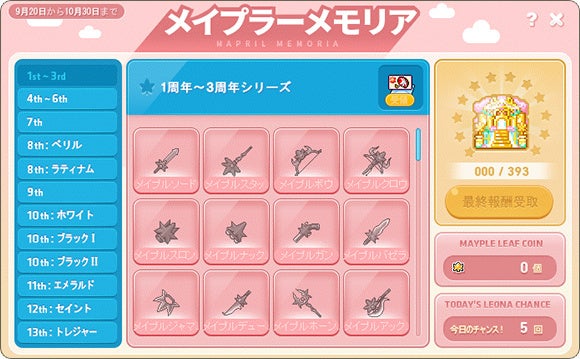 NPC「レオナ」と一緒に、歴代の周年装備を集めた図鑑「メイプラーメモリア」を作り上げましょう。