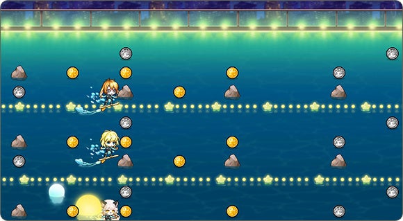 第1弾は、マッチングした3人がサーフィンで競う「インフィニティレース」。レーン上の障害物の石を避けてコインを集めながらゴールを目指しましょう。順位に応じて、イベントアイテム「メイプラーキャンディー」をプレゼントいたします。