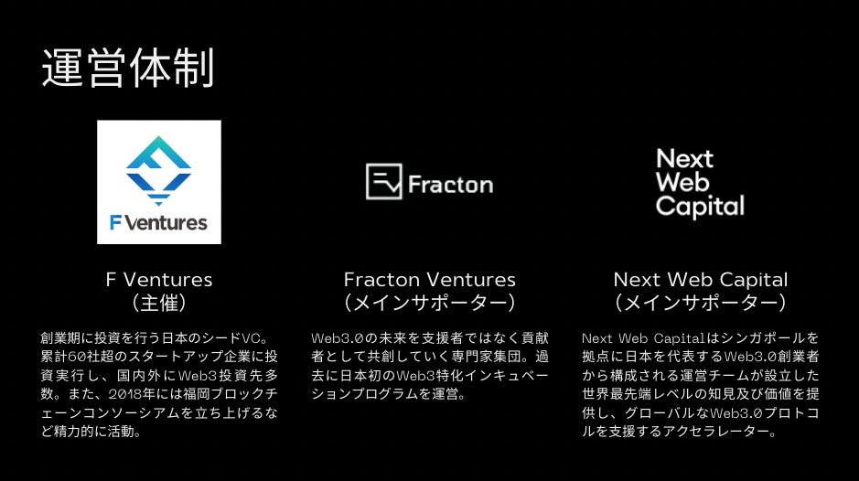 Web3インキュベーションプログラム223(https://223-fv.xyz/)はWeb3領域へ挑戦する起業家を後押しするインキュベーションプログラムです。サポーターとして著名な投資家・起業家の方々にご協力いただきます。4ヶ月間でWeb3領域での挑戦・事業運営に必要な知識のインプットと事業の磨き込みを行い、日本から世界で戦う起業家の輩出を目指します。