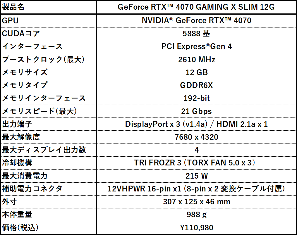 https://jp.msi.com/Graphics-Card/GeForce-RTX-4070-GAMING-X-SLIM-12G