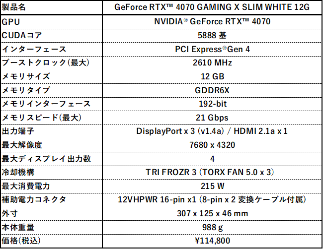 https://jp.msi.com/Graphics-Card/GeForce-RTX-4070-GAMING-X-SLIM-WHITE-12G