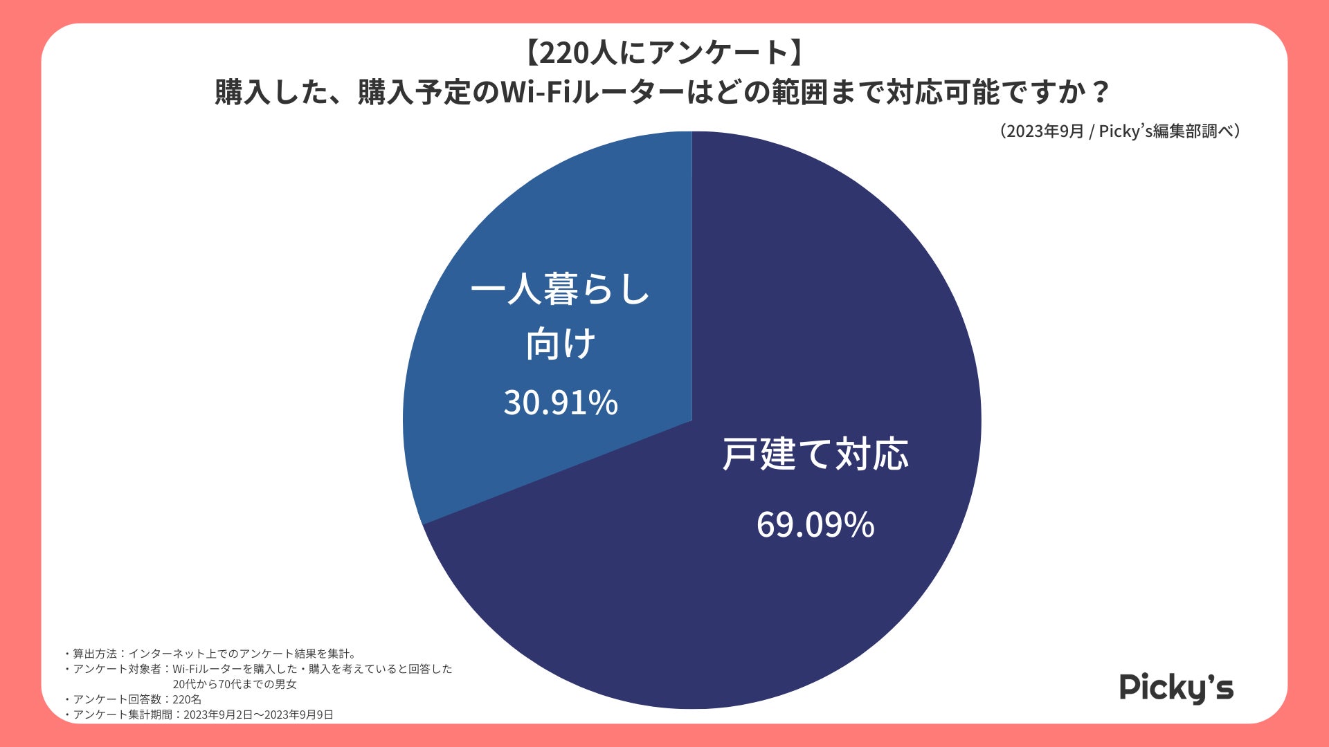先ほどのWi-Fiルーターを選ぶポイントとして、「価格」の次に回答が多かった「対応範囲」についてもアンケート回答していただきましたところ、約7割の人が「戸建て対応」と回答いたしました。