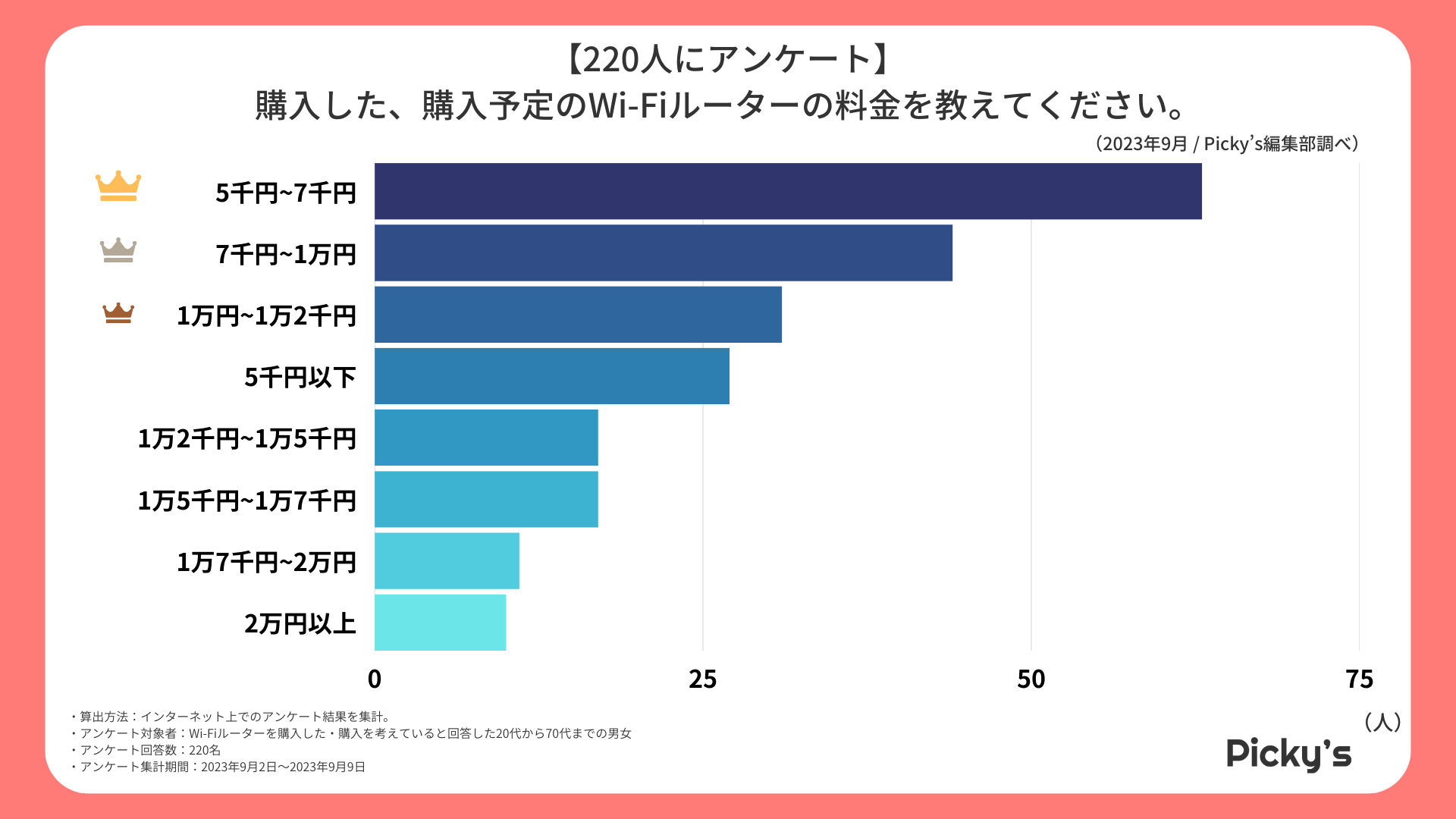 アンケート調査の結果、「5千円~7千円」「7千円~1万円」「1万円~1万2千円」の低価格帯~中価格帯が最も多く選ばれました。