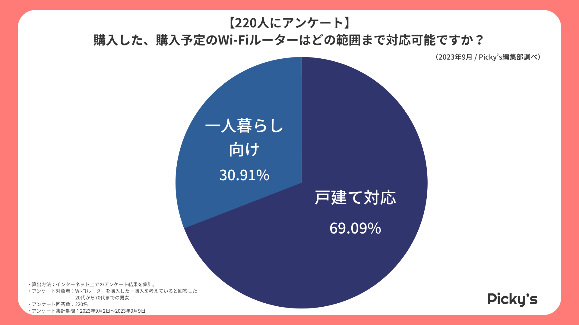 先ほどのWi-Fiルーターを選ぶポイントとして、「価格」の次に回答が多かった「対応範囲」についてもアンケート回答していただきましたところ、約7割の人が「戸建て対応」と回答いたしました。