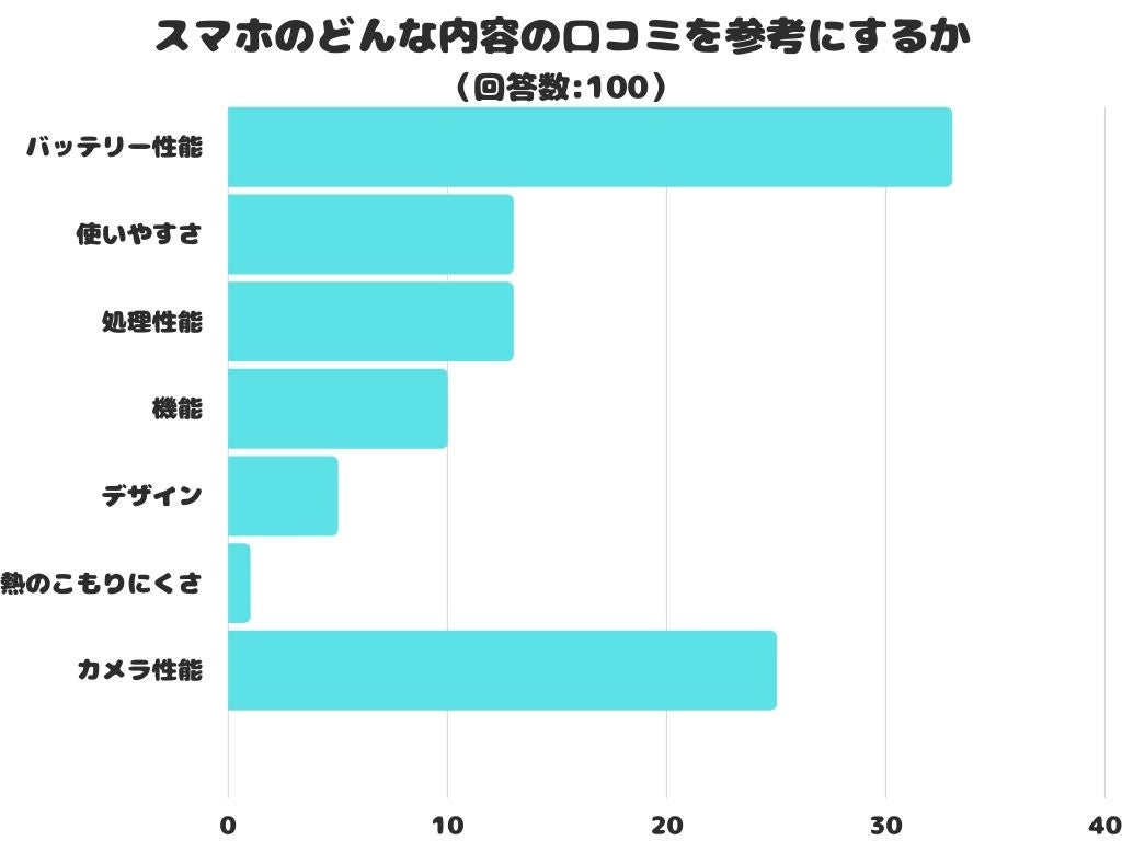 スマホのどんな内容の口コミを参考にするかをアンケートにて調査したところ、1位は「バッテリー性能」でした。