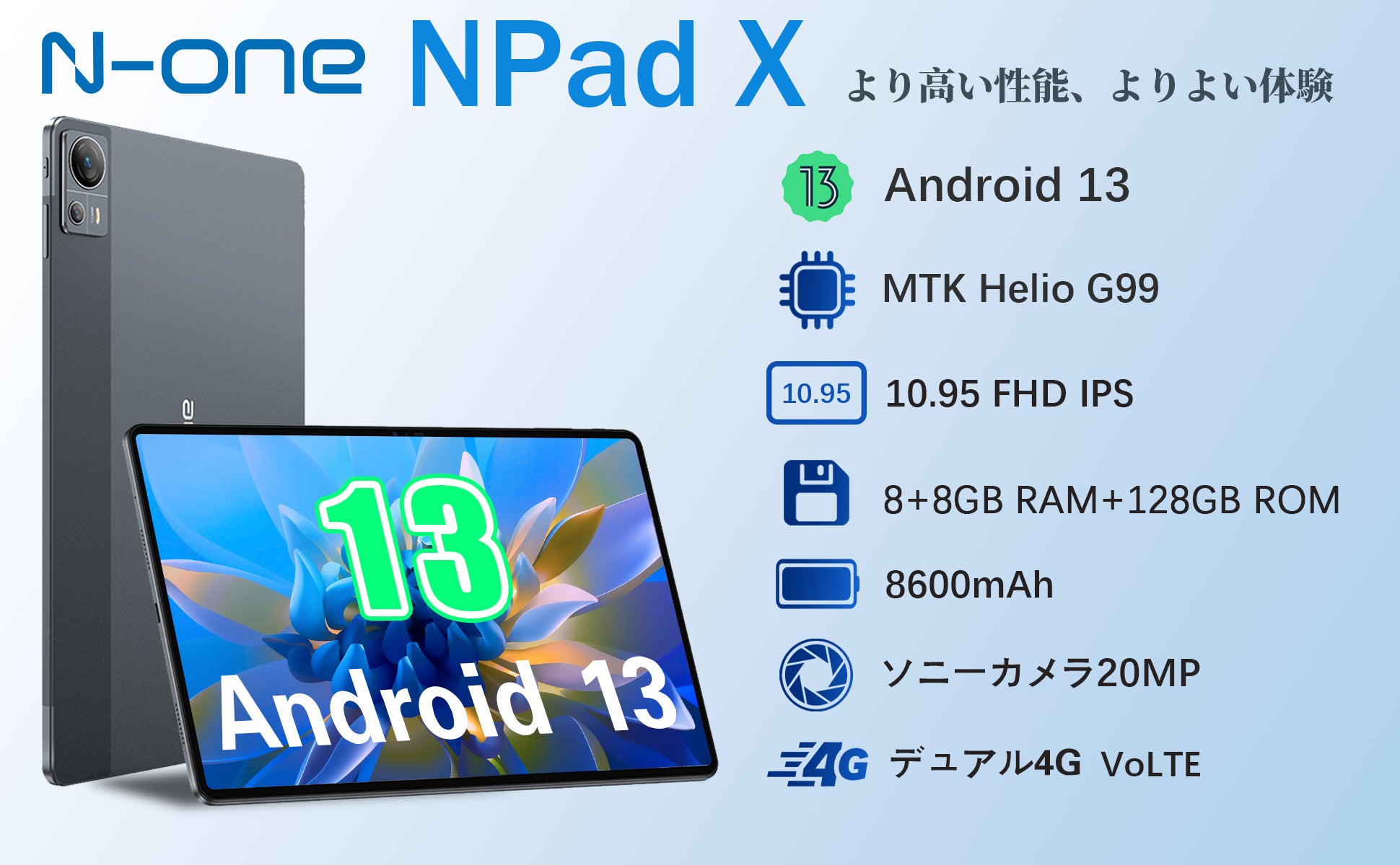 MTK Helio G99搭載 / 11インチ / Android 13 / 16GB(8GB+8GB仮想)RAM+128GBストレージ / 2000×1200解像度 / 8600mAh PD快速充電 / LTE通話/ 20MPデュアルカメラ+8MPフロント