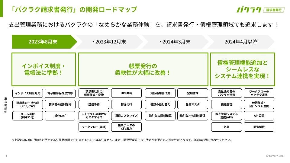 バクラク請求書発行は、インボイス制度や電子帳簿保存法の要件を満たした請求書を作成・送付・保存が可能なプロダクトです。2023年8月の正式リリースに合わせ、開発ロードマップを公開しています。今回の請求書以外の帳票作成機能は、柔軟に帳票発行ができる機能拡充の第1弾としてリリースしました。
