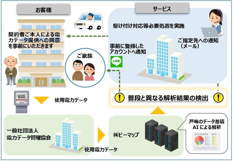2020年6月に電気事業法の法改正により、電気事業者以外の事業者も含め、契約者ご本人の同意を得た個人の電力データの活用が可能となりました。ビーマップは、この法改正に基づき、経済産業大臣によって認定された一般社団法人電力データ管理協会を通じ、契約者ご本人の同意を得た電力データの提供を受けます。本サービスは、電力使用量をデジタルで計測するスマートメーターの電気利用状況を確認することで、相手の様子を見守る新しいサービスです。普段の生活とは異なる電力使用の解析結果を検出することで異常を察知できます。ご家族やご友人など、事前にご登録いただいた方へ通知し、駆け付け対応等必要な処置を行います。スマートメーターが設置された住宅であれば特別な機材の設置や通信環境の整備は一切不要で、機器等によるコストや月額通信費は不要です。