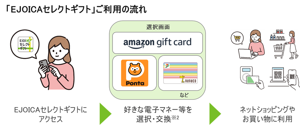 (1)「EJOICAセレクトギフト」は、さまざまな電子マネー等の中から自由に選び、交換できる電子マネーギフトです。