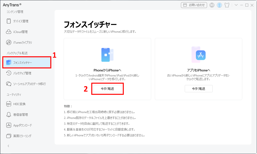 Step2.画面の左側で「フォンスイッチャー」をクリックして、「PhoneからiPhoneへ」項目で、「今すぐ転送」をクリックします。
