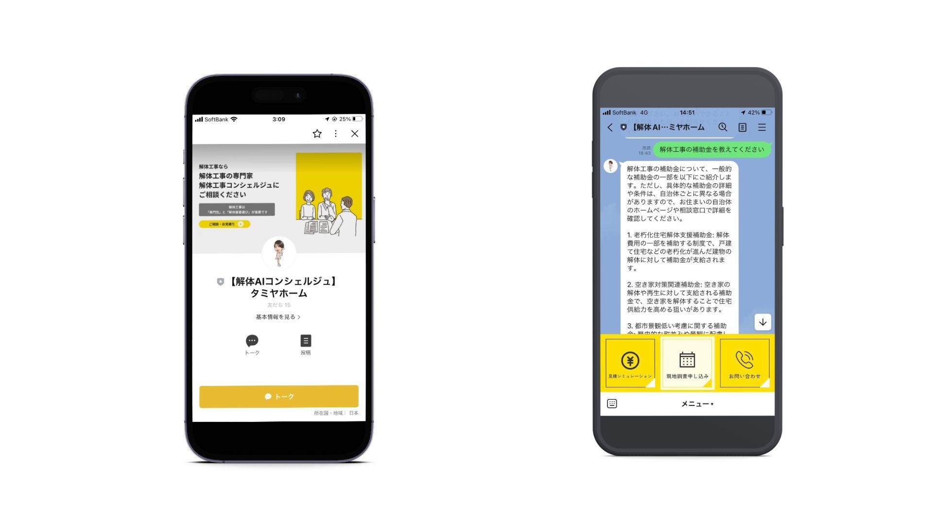 タミヤホームが提供する「解体AIコンシェルジュ」は、「見積シミュレーション」と「AIチャットボット」の2つの主要機能を備えたサービスです。このサービスを通じて、消費者は解体工事に関する知識を獲得し、概算見積もりを短時間で手軽に得ることが可能になります。