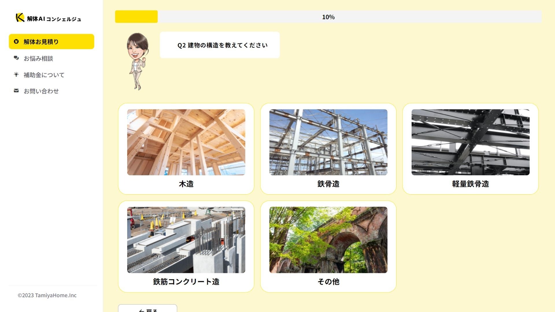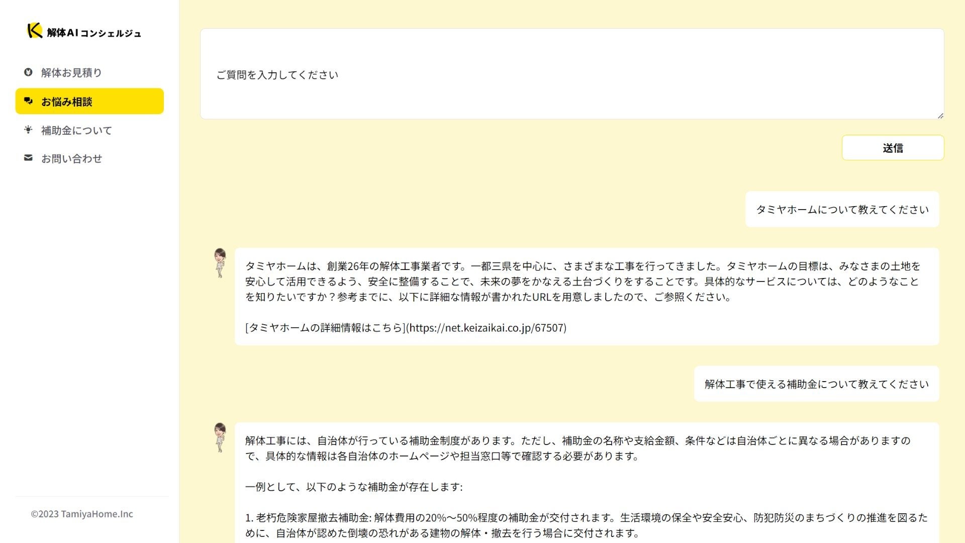 タミヤホームが提供する「解体AIコンシェルジュ」は、「見積シミュレーション」と「AIチャットボット」の2つの主要機能を備えたサービスです。このサービスを通じて、消費者は解体工事に関する知識を獲得し、概算見積もりを短時間で手軽に得ることが可能になります。