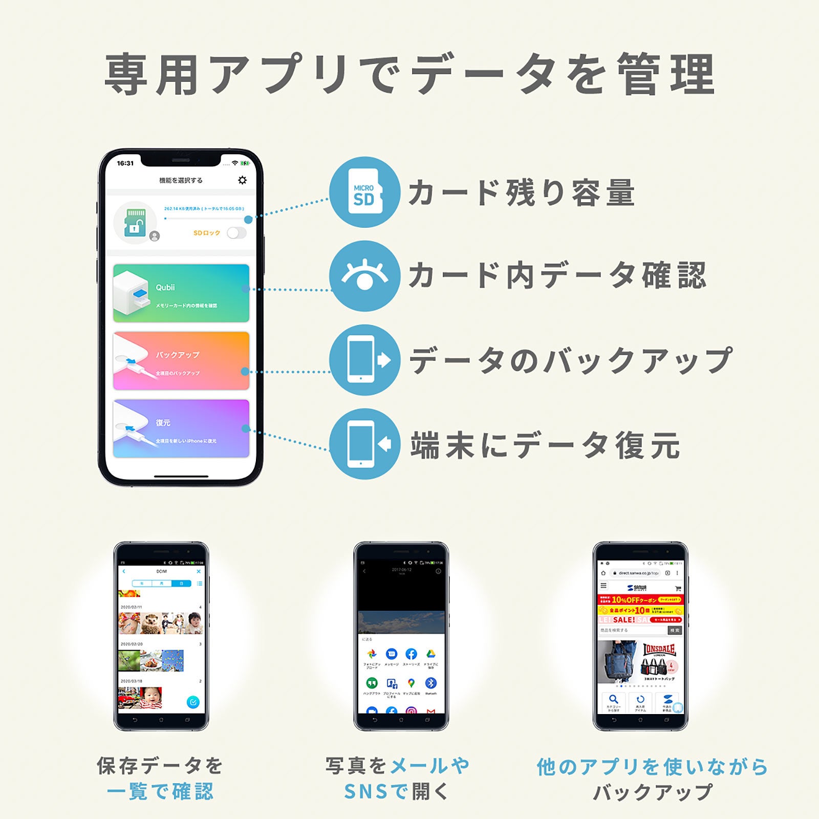 ACアダプタ、本製品、iPhoneやiPad、スマートフォンをケーブルで接続し、専用アプリ「Qubii Pro」を使用することで、接続するたびに自動でデータをバックアップできます。接続するだけで自動バックアップがとれるので、他のアプリを起動しながら使用ができます。本製品のケーブル差込口は、Type-Cポートを採用しています。