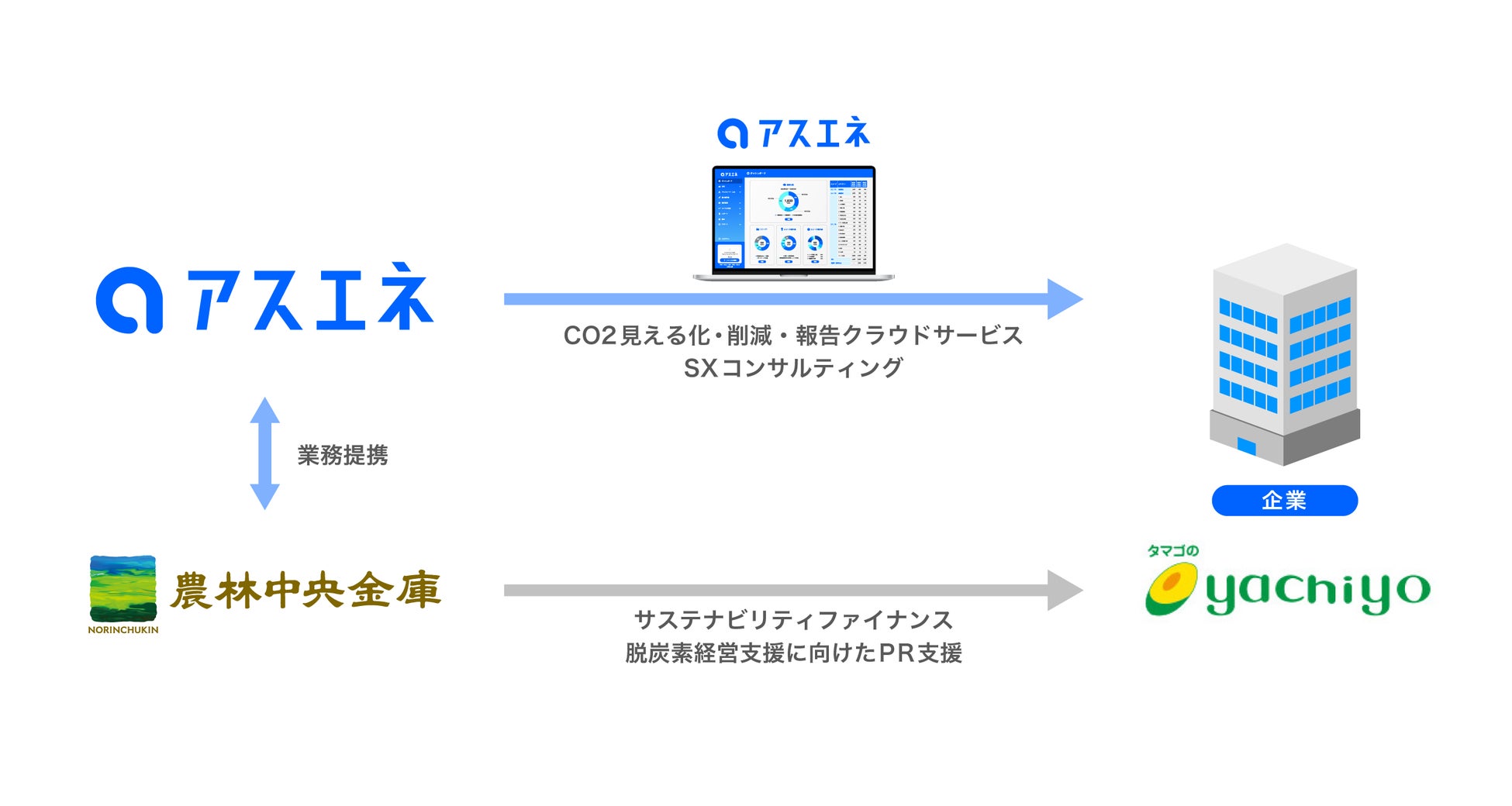アスエネ株式会社(本社:東京都港区、代表取締役CEO:西和田 浩平、以下「当社」)は、連携先の農林中央金庫(本社:東京都千代田区、代表理事理事長:奥 和登、以下「農林中金」)とともに、株式会社八千代ポートリー(本社:神奈川県横浜市、代表取締役社長:笠原 政利、以下「八千代ポートリー」)へ、CO2排出量見える化・削減・報告クラウドサービス「アスエネ」を提供しました。八千代ポートリーの鶏卵生産およびサプライチェーン全体におけるCO2排出量削減に貢献していきます。