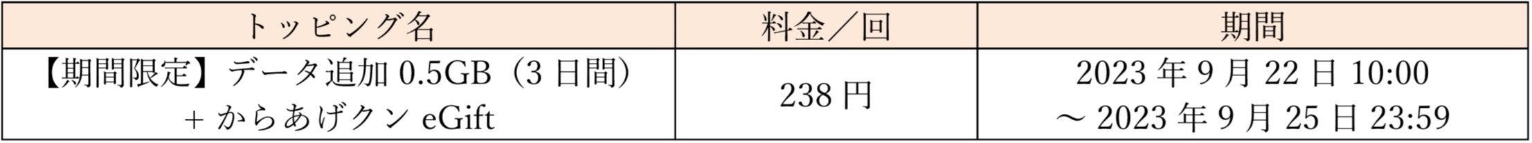 ローソンの「からあげクン」(238円相当)のギフト券と、「データ0.5GB(3日間)」がセットで238円のため、0.5GBのデータが実質無料で利用できます。データのちょい足しついでに、からあげクンをおトクにお求めいただけます。